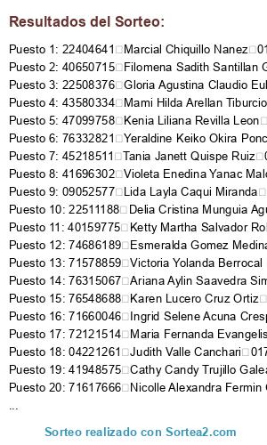 Lista de participantes: 22515479 Agustina Gaspar Valerio 006, 22493881 Alberta Sifuentes Llagas 016, 41601609 Alfredo Valois Dominguez Rosales 009, 22473962 Alicia Avila Jesus 019, 41367646 Alicia Bela Ayllon Ramos 011, 45399169 Alicia Lidia Barrueta Claudio 011, 22507004 Ana Ivonne Aparcana Laos 017, 42598690 Ana Luz Vega Avila 014, 44810014 Ana Melva Salazar Marino 005, 41638774 Ana Monica Pardave Vergara 018, 71057330 Andrea Alexandra Perez Rojas 010, 41741978 Angela Miriam Salazar Condezo 017, 46853063 Angelica Cabrera Albornoz 006, 22477254 Angelica Maria Tolentino Leon 018, 73216932 Anghi Alejo Garcia 016, 40260329 Antonia Alicia Pablo Marino 006, 47284943 Anyela Espiritu Huaman 005, 76315067 Ariana Aylin Saavedra Simon 011, 22879760 Asunciona Arango Ortega 016, 45408268 Aurelia Pilar Trujillo Correa 016, 42150579 Avi Griselda Aponte Vega 011, 40489636 Aylensy Ribera Ramirez 006, 75015188 Beatriz Gomez Leandro 016, 22674386 Belia Maria Meza De Pozo 019, 22406176 Bertha Eumelia Vidal Vargas 016, 06279096 Bertha Gladys Nieves Vela 012, 22414062 Bertha Ordonez Leon 014, 46812768 Bethsabe Jorge Templo 019, 76544471 Betzabe Duran Rivera 009, 45718176 Blanca Sharon Inocencio Jaimes 014, 23169170 Blandina Natividad Rodriguez 009, 47548517 Brigette Martinez Guillermo 013, 44201995 Candelaria Del Pilar Alomia Vitor 017, 22415970 Carmen Diaz Ingunza 006, 44083913 Carmen Lizbeth Marquez Visag 001, 22400336 Carmen Ortiz Salas 016, 42072631 Catalina Angelica Nieto Ortega 006, 22411654 Catalina Atanacio Bejarano 014, 41948575 Cathy Candy Trujillo Galeano 006, 45576253 Celia Rumi Leiva 011, 74429215 Celina Minaya Quispe 011, 72761953 Cinthia Mayte Vargas Susanivar 011, 44962691 Cintia Katerin Carhuaz Millan 006, 22487900 Clara Nataly Rivera Matos 018, 22500001 Cledida Rosa Quiroz Tucto 017, 80006920 Clenda Orfila Cierto Berrospi 005, 22403350 Concepcion Valentina Cabanillas Malpartida 018, 45498386 Dalila Asto Naupa 006, 41411694 Dalmiro Daniel Roque Palpa 014, 72229973 Damaris Maiz Daga 016, 71888054 Danha Jenifer Alva Palacios 014, 40695605 Danitza Danesa Asca Morales 014, 72487997 Dayra Alannis Yersely Aquino Leon 009, 48503533 Debora Keren Ojeda Morales 002, 45449742 Deisy Edith Bustamante Madrid 019, 22419488 Delia Alejo Tumbay 001, 22511188 Delia Cristina Munguia Agui 006, 22664803 Delia Rosa Daga Falcon 016, 74616208 Delsy Delina Velasquez Torres 014, 41798672 Dency Ortiz Ponciano 006, 44503594 Denis Shara Rasales Morales 013, 46825048 Deny Aquino Espiritu 010, 72245852 Deysi Yanina Laurencio Bejarano 016, 40416864 Diana Baylon Rivera 008, 22507309 Diana Esther Soto Coz 013, 41086178 Diana Lizbeth Daza Perez 007, 71544009 Diana Vanessa Andres Calderon 009, 46384680 Dina Lizbet Gomez Carpio 017, 22434871 Donata Cayetano Beraun De Prado 002, 22440689 Dora Luz Rivera Trujillo 014, 47025708 Doris Prudencio Roman 013, 73286927 Ebelyn Jemina Fuentes Ardiles 010, 40863640 Edith Esther Mejia Ricapa 009, 43007502 Edith Marcelina Villareal Moreno 017, 42582080 Edwin Lino Pardo Obregon 016, 31624941 Elisa Uldavia Maguina Figueroa 016, 22470447 Elizabeth Cabrera Castaneda 001, 44080479 Elizabeth Celiz Pena 011, 42741257 Elizabeth Roxana Huaqui Alvarado 012, 22517709 Elizabeth Salazar Crespo 006, 43527360 Elsa Perez Aranda 019, 43527360 Elsa Perez Aranda 005, 22640695 Ema Limaymanta Lorenzo 002, 41974842 Emilia Encarnacion Guerra Paz 014, 44342676 Eny Gaby Diaz Salgado 006, 22406381 Epifanio Gaudencio Davila Rivera 016, 44950489 Erika Juan De Dios Huanca 017, 22521289 Ermelinda Patricia Bernardo Cori De Tinta 006, 74686189 Esmeralda Gomez Medina 018, 71788420 Esmeralda Judith Cuellar Martinez 002, 74657368 Estalita Alida Benancio Gregorio 007, 43103698 Esther Aranda Mendoza 002, 77495559 Esther Rosalinda Amado Chavez 007, 00996361 Esther Saavedra Jaramillo 017, 04205266 Eunice Porras De La Rosa De Toma 006, 46771757 Eva Melina Blas Alarcon 003, 42687593 Fatima Eleximia Montero Follegati 019, 22488655 Feliciana Juanan Retis 018, 22658279 Felisa Meza Huerto 002, 77387432 Fernando Tadeo Tarazona 006, 40650715 Filomena Sadith Santillan Gonzales 019, 72377880 Fiorela Sarabia Sanchez 009, 72427325 Fiorella Judith Montes Garay 012, 76862594 Fiorella Rosalvina Urquiza Reyes 004, 41632821 Flavia Chagua Salazar 006, 45975454 Floida Clusyola Sobrado Pineda 007, 47449214 Flor Elena Ramos Ribera 006, 71322747 Flor Maria Aguirre Dominguez 004, 46704895 Flor Marissa Chavez Falcon 017, 73620557 Floricel Neyva Serrano Cajas 002, 22461307 Florinda Gonzales Venturo 012, 22503135 Frida Veronica Marrujo Orbezo 018, 72664304 Gianella Priscilla Santa Cruz Cruz 014, 22489566 Gina Del Pilar Mauricio Encarnacion 007, 48662478 Gina Reyes Mendoza 006, 42067045 Gioliana Tapullima Isuiza 016, 45831157 Gisela Salazar Cantaro 005, 22674236 Gisella Rosa Francisca Centeno 002, 22474224 Gladis Otilia Solorzano Armas 007, 22508376 Gloria Agustina Claudio Eulogio De Esteba 010, 44164901 Gloria Celia Pantoja Ramirez 014, 22430318 Gloria Lucia Rojas Martinez 001, 00186934 Gloria Victoria Rimas Cruz 011, 04074070 Graciela Patricia Salinas Arias 014, 04074070 Graciela Patricia Salinas Arias 014, 71059692 Graciela Rojas Duran 009, 72772496 Grecia Sharon Penadillo Rivera 016, 22491668 Guadalupe Pardo Norena 018, 44770127 Guicela Llanos De Lao 005, 45954168 Helen Tessy Alva Espinoza 007, 22486912 Hermelinda Cajas Merino 010, 47412358 Hermelinda Huanaco Huaypuna 001, 22432731 Hilda Judith Ramos Paucar 014, 47739419 Hilda Luci Tumbay Canchaparan 001, 47657788 Ines Flores Picon 011, 46744956 Ines Norena Panduro 008, 71660046 Ingrid Selene Acuna Crespo 016, 22517816 Inocenta Llanto Vigilio 011, 47083872 Iris Karina Prado Cayetano 004, 22503549 Isabel Illatopa Ermitano 004, 22400169 Isabel Millan Mori 011, 40422574 Jacqueline Marleni Tarazona Rojas 001, 22502243 Jacqueline Soledad Leon Argandona 008, 41235882 Janeth Machado Agustin 014, 40237194 Janeth Robertina Onofre Eduardo 018, 42985910 Janett Jacqueline Atencia Tarazona 001, 74994603 Janina Dely