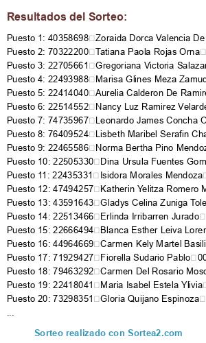 Lista de participantes: 40344560 Abad Rojas Palacios 008, 41264234 Abel Espinoza Martinez 006, 43513997 Adelayda Pardave Lazaro 017, 73589289 Adrian Alvarez Gonzales 008, 74361666 Aide Elvia Raymundo Hilario 013, 22527562 Alejandra Trujillo Santos 014, 77080197 Alexandra Yesenia Igarza Tisoc 013, 75003898 Alexsandra Yanira Ferrer Rojas 012, 80005002 Amalia Hurtado Garcia 012, 44215019 Amarut Amarilis Maylle Mendoza 017, 22643094 Amelia Bravo Cespedes De Orbezo 004, 73311391 Ana Baltazar Masgo 001, 21258665 Ana Eulalia Hidalgo Arias 001, 72737835 Ana Kelly Contreras Carrasco 011, 44115362 Ana Mely Tenazoa Rodriguez 001, 41638774 Ana Monica Pardave Vergara 018, 44379639 Angela Fiorella Walde Ramirez 012, 43566852 Angela Mily Salazar Figueroa 008, 41741978 Angela Miriam Salazar Condezo 017, 46853063 Angelica Cabrera Albornoz 006, 45608134 Angelica Edith Celestino Silvestre 019, 22477254 Angelica Maria Tolentino Leon 018, 22507493 Angelica Ruth Marin Borunda 012, 74993290 Angelina Maricielo Pujay Huerta 018, 70685100 Angie Nikole Velasquez Aguirre 008, 42945689 Anhyela Lizbeth Solano Ramirez 013, 70800914 Anmd Jagger Kesvy Hurtado Pimentel 013, 47284943 Anyela Espiritu Huaman 005, 22414040 Aurelia Calderon De Ramirez 017, 22484746 Aurelia Falcon Pinan 008, 74352676 Beatriz Matos Eusebio 011, 43222716 Beatriz Melany Guillermo Castillo 006, 40309661 Bertha Janett Aliaga Arnedo 005, 22476491 Bertha Lida Sanchez Mori 011, 47980862 Betsi Cristina Rivera Estela 013, 71059766 Betty Ingrit Lazo Aliaga 005, 46939821 Betzabeth Marlene Chavez Bravo 001, 22666494 Blanca Esther Leiva Lorenzo 001, 22408901 Blanca Violeta Bustamante Loarte 006, 44503816 Bleidy Leidy Lopez Victorio 006, 42757238 Briggith Evellyn Martinez Jara 014, 73181918 Brighit Rosalinda Villanueva Maylle 009, 44268408 Brigida Elva Soto Yanac 003, 74933626 Britney Nicol Sanchez Grecia 006, 79463292 Carmen Del Rosario Mosquera Lorenzo 008, 44964669 Carmen Kely Martel Basilio 013, 22417229 Carmen Luz Miranda Y Camacho 008, 08119266 Carmen Mercedes Anton Aiquipa 011, 22400336 Carmen Ortiz Salas 016, 22518924 Carmen Rosa Miranda Gonzalez 019, 22485916 Carmen Sadid Pizarro Alvarado 001, 80044521 Carol Maria Sandobal Francia 001, 73384799 Cassandra Marielena Hinostroza Ramirez 011, 75166745 Catherine Stephanie Velez De Villa Robles 008, 00093388 Cecilia Almira Montecillo Santibanez 018, 45464038 Cecilia Pimentel Escobal 001, 08115816 Celia Lucia Jara Martel 003, 41776363 Cinthia Carmela Salcedo Davila 004, 42503202 Cinthya Dolly Zelaya Baldeon 014, 45882375 Cyndi Sheley Ureta Hilario 011, 22426519 Dadeyva Medina Castaneda 008, 73944184 Dafney Creyssi Pasquel Santos 008, 003201487 Dairelys Haidee Escobar Tua 006, 47573183 Dalila Justo Aguirre 005, 41411694 Dalmiro Daniel Roque Palpa 014, 21145155 Delfina Cagna Figueroa 014, 42100983 Delia Dalila Vargas Rimac 014, 22963525 Delia Margarita Fabian Rojas 011, 70851343 Diana Minoska Soto Palomino 013, 43484365 Dina Luz Davila Tuanama 001, 40250615 Dina Maiz Malpartida 011, 22505330 Dina Ursula Fuentes Gomez 017, 44652476 Dina Vega Llagas 014, 42406580 Diogenes Graciana Huaranga Cori 006, 47025708 Doris Prudencio Roman 013, 41633608 Edith Laura Ayzanoa Vizcarra 012, 44332543 Edith Melina Trujillo Calero 017, 72375951 Edith Yasdaly Bartolome Tarazona 008, 42606653 Edith Yavana Albornoz Tucto 013, 22481142 Edith Yeni Soria Malpartida 012, 22890808 Elia Obregon Eulogio 008, 40694979 Elizabeth Doris Yalico Flores De Hurtado 017, 22508247 Elizabeth Eusebio Segura 011, 42741257 Elizabeth Roxana Huaqui Alvarado 016, 22517709 Elizabeth Salazar Crespo 006, 22477050 Elsa Aquino Maiz 008, 42122560 Elva Cristina Rodrguez Arias 019, 22894740 Elvia Ramos Espinoza 003, 22511221 Elvira Madeleine Ampudia Bonar 011, 22474876 Emma Rosario Rivera Miraval 011, 22513466 Erlinda Irribarren Jurado 008, 06623197 Escolastica Chavez Cardenas 008, 75695963 Esmeralda Toribia Albornoz Ramos 003, 78719202 Esperanza Zuniga Fanante 012, 47422537 Ester Livia Ramos 008, 43103698 Esther Aranda Mendoza 002, 00996361 Esther Saavedra Jaramillo 013, 22722977 Eufracia Martin Ferrer 006, 75237709 Eugenia Javier Garcia 005, 40227754 Eutemia Cuellar Espinoza 018, 40554403 Eva Maria Mandujano Papas 012, 42657387 Evalina Dalila Fernandez Huacho 012, 44083909 Feby Mavet Espiritu Encarnacion 005, 22672231 Felicita Quispe Uscamayta 004, 22701057 Felicitas Lino Norena 008, 40650715 Filomena Sadith Santillan Gonzales 019, 42908098 Fiorela Zevallos Vigilio 017, 73619354 Fiorella Marisa Berrospi Castillo 012, 71929427 Fiorella Sudario Pablo 003, 10861353 Flor Angelica Alarcon Principe 014, 42980119 Flor Cecilia Ferrer Escobar 014, 42106568 Flor De Belen Reategui Flores 008, 73786886 Flor Marlita Ayra Rueda 012, 22461307 Florinda Gonzales Venturo 012, 47813048 Gavy Yenina Flores Guzman 001, 73265521 Geydi Dayana Nolasco Lastra 001, 45046527 Giannina Solinka Trujillo Aguirre 013, 22512280 Gilda July Espejo Robles 006, 46545787 Gimena Hellem Vega Toribio 016, 42067045 Gioliana Tapullima Isuiza 005, 22494587 Giovana Silvia Salgado Cardenas 008, 22474224 Gladis Otilia Solorzano Armas 009, 43591643 Gladys Celina Zuniga Tolentino 018, 71570604 Gladys Maritza Reyes Manayay 019, 22508376 Gloria Agustina Claudio Eulogio De Esteba 009, 22475526 Gloria Huaranga Huallpa 011, 73298351 Gloria Quijano Espinoza 006, 22705661 Gregoriana Victoria Salazar Guerra 008, 80472423 Guadalupe Sofia Thea Hidalgo 017, 61776898 Guadalupe Yomira Jaramillo Inga 004, 22421213 Gudelia Suarez Rodriguez 006, 22666485 Guillermina Filomena Francisco Centeno 017, 22486355 Helen Nalda Acevedo Laguna 014, 42506208 Helmer Huaman Meza 012, 22419627 Hilda Concepcion De Hidalgo 017, 22432731 Hilda Judith Ramos Paucar 014, 22400591 Hortencia Zevallos Garcia 001, 23168767 Humbelina Sandoval Rojas 012, 44864682 Indhira Zinaida Chavez Gomez 019, 22739408 Irma Cordero Fabian Cardenas 008, 08399334 Isabel Eufrosina Chavez Lagos 004, 22400169 Isabel Millan Mori 011, 22659270 Isabel Ramirez Condezo 004, 