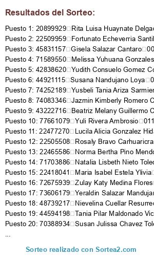 Lista de participantes: 45464038 Cecilia Pimentel Escobal 001, 48489706 Claudia Betzabe Tolentino Santiago 001, 73265521 Geydi Dayana Nolasco Lastra 001, 19921805 Gladys Aydee Sosa Pinto 001, 80490015 Jacqueline Juliana Bartra Alvarado 001, 40245977 Judith Rosa Gavidia Espinoza 001, 22413517 Nelida Doroteo Hilario 001, 22489824 Olivia Alsina Soto Santiago De Chagua 001, 22505508 Rosaly Bravo Carhuaricra 001, 73589286 Sheyla Cristina Martel Enrique 001, 80083994 Yeny Adaia Ochoa Alarcon 001, 44964356 Yolfa Luz Meza Gomez 001, 22643094 Amelia Bravo Cespedes De Orbezo 002, 46801336 Brenda Nataly Orbezo Bravo 002, 40422556 Joanna Melissa Orbezo Bravo 002, 40448757 Johan Jano Orbezo Bravo 002, 41412133 Rody Soraida Pinto Sipion 002, 71269441 Rosmeri Deysi Cruz Rivera 002, 08115816 Celia Lucia Jara Martel 003, 73305886 Skarly Brigitte Huallanca Cespedes 003, 08115816 Celia Lucia Jara Martel 003, 47050450 Yesenia Deys Rivera Daga 004, 47284943 Anyela Espiritu Huaman 005, 46502992 Karen Milagros Rojas Aponte 005, 44303176 Mirla Luisa Rivera Maiz 005, 22482834 Primitiva Obregon Duran 005, 22453653 Rumalda Rivera Mays 005, 42838620 Yudith Consuelo Gomez Colonia 005, 42934804 Fausto Roberto Cruz Refulio 006, 80122882 Judith Cueva Salgado 006, 43671509 Lleny Ramirez Lozano 006, 22720629 Maria Estela Enrique Rosales 006, 43057552 Oliveria Laurencio Enrique 006, 16697051 Ricardina Aurora Vasquez Cubas 006, 22674216 Rosa Luz Avila Lopez 006, 71387425 Stefany Mishel Aquino Espejo 006, 22753566 Gregoriana Gonzales Robles 008, 22435331 Isidora Morales Mendoza 008, 22664344 Liliana Zevallos Avila 008, 22476488 Noimi Ruth Fonseca Livias 008, 22429385 Rita Aparicia Lobaton Castaneda 008, 22413227 Sonia Ponce Ramirez 008, 71740990 Yuliana Cristina Celadita Cardenas 008, 44201995 Candelaria Del Pilar Alomia Vitor 009, 73613193 Luz Belen Rivera Apaza 010, 42178548 Martina Andrade Fretel 010, 44886162 Silvia Gonzalez Villena 010, 73612261 Veronica Hurtado Nolasco 010, 45205720 Fiorela Rodriguez Cuchilla 011, 22462483 Flavia Nilda Martin Marticorena 011, 46039305 Jhonattan Jose Marquez Ruiz 011, 47797978 Juana Aponte Munos 011, 43462513 Lisbet Maylle Ortiz 011, 40097458 Maribel Santos Neyra 011, 71390899 Resnik Alonso Espinoza 011, 22530299 Rosa Maria Sanchez Lopez 011, 22406653 Santamaria Albornoz Nacion 011, 46392075 Saly Joana Rengifo Rivaaguero 011, 47907265 Evonny Veronica Cruz Jesus 011, 47070996 Aydee Angelica Fabian Cordova 012, 71199595 Betsy Olenka Acero Dominguez 012, 22475866 Cherly Marlene Anastacio Gonzales 012, 22512573 Enrique Mariano Melgar Sanchez 012, 43820311 Fiorela Laura Lorenzo Santa Cruz 012, 72720186 Jimena Thalia Santillan Ramos 012, 71870081 Kely Malu Chavez Espiritu 012, 76523784 Kiara Yaki Leandro Loyola 012, 22506267 Maria Isabel Espinoza Rojas 012, 22508016 Mercedes Rubio Olortegui 012, 47015516 Sheyli Darmin Quispe Albornoz 012, 47481335 Yesmi Liz Calderon Natividad 012, 22486859 Milagros Consuelo Ortiz Mendoza 012, 74361666 Aide Elvia Raymundo Hilario 013, 45282630 Alejandrina Hermelinda Borja Lopez 013, 72652674 Angelica Lesli Alvarado Leon 013, 22403350 Concepcion Valentina Cabanillas Malpartida 013, 46567734 Elsa Virginia Chavez Sipion 013, 00996361 Esther Saavedra Jaramillo 013, 41562338 Fabiola Maria Cantalicio Zambrano 013, 73334806 Gina Lizbeth Valverde Tarazona 013, 47133009 Giovanna Mirtha Masgo Navidad 013, 47992295 Kelly Leslly Hurtado Cotrina 013, 74127687 Milagros Andrea Solorzano Aquino 013, 73610950 Miriam Salome Cruz Cardenas 013, 73650713 Nahomy Rubali Garcia Dionicio 013, 72368062 Noimi Campos Villanueva 013, 48084049 Rosa Janet Vargas Ceferino 013, 74073358 Sarai Franchesca Duran Vara 013, 74071054 Sherly Analy Dionicio Chacon 013, 72383370 Yesly Patricia Rivera Duran 013, 22404726 Yolanda Felisa Beteta Lavado 013, 74927454 Judith Aliaga Atanacio 014, 40771175 Larissa Soledad Briceno Quijano 014, 70033471 Liz Jakeline Hidalgo Celis 014, 71403897 Luz Yelita Davila Chuquiyauri 014, 46644234 Miluzhka Yashiro Aguero Rafael 014, 40344568 Patricia Garay Retis 014, 40794807 Silvina Rivas Villavicencio 014, 09749106 Sonia Guadalupe Espinoza Ramos 014, 46034611 Jane Karen Valdes Trujillo 014, 46048778 Jennifer Nohely Scharff Reategui 016, 48159664 Betty Victoria Ramos Perez 017, 40619183 Enriqueta Sanchez Herrera 017, 44962711 Eulalia Amelia Fabian Recinas 017, 73629726 Iris Osvina Ramos Rivera 017, 41638774 Ana Monica Pardave Vergara 018, 74686189 Esmeralda Gomez Medina 018, 10458637801 Guissela Isabel Tucto Cruz 018, 22465586 Norma Bertha Pino Mendoza 018, 47449231 Veronica Wendy Soto Vigo 018, 80247499 Virginia Alania De La Cruz 018, 48235190 Karem Brissel Gomez Maurtua 019, 48799617 Yanela Celmira Venturo Ramrez 019.