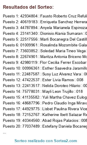 Lista de participantes: 40344560 Abad Rojas Palacios 008, 74361666 Aide Elvia Raymundo Hilario 013, 22643094 Amelia Bravo Cespedes De Orbezo 002, 41638774 Ana Monica Pardave Vergara 018, 75251428 Andrea Priscila Gutierrez Pianan 019, 41741978 Angela Miriam Salazar Condezo 017, 47284943 Anyela Espiritu Huaman 005, 44787894 Anyela Marianela Espinoza Ibazeta 008, 22460023 Aurora Chamoli Canturin 004, 07256530 Basilia Dionicia Santi Seis 002, 73582962 Belinda Skarlet Ramirez Juancho 005, 75188283 Berita Escobal Martel 002, 22472730 Bertha Cordova Misari 019, 22476491 Bertha Lida Sanchez Mori 011, 22414062 Bertha Ordonez Leon 014, 73275022 Betsy Victoria Ponciano Lopez 008, 41582531 Bina Levi Cotrina Carlos 002, 46801336 Brenda Nataly Orbezo Bravo 002, 72260085 Brigitt Lucero Soto Acosta 014, 45991504 Carla Esteban Ponce 001, 22518924 Carmen Rosa Miranda Gonzalez 019, 43494971 Celia Rapri Solano 006, 42503202 Cinthya Dolly Zelaya Baldeon 014, 48489706 Claudia Betzabe Tolentino Santiago 001, 22489260 Cledy Mabel Rosales Flores 011, 22403350 Concepcion Valentina Cabanillas Malpartida 013, 22652095 Cristina Puente Y Aguirre 010, 22511188 Delia Cristina Munguia Agui 006, 42100983 Delia Dalila Vargas Rimac 014, 41798672 Dency Ortiz Ponciano 013, 47130613 Diana Pilar Solorzano Tolentino 018, 22505330 Dina Ursula Fuentes Gomez 017, 23141340 Dionisio Alania Sumaran 005, 75465359 Dorcas Sarai Ricopa Ramos 019, 41633608 Edith Laura Ayzanoa Vizcarra 012, 22415336 Eduarda Zevallos De Ramirez 008, 77696828 Eliana Karol Salas Guzman 001, 22418332 Elisa Del Pilar Taboada Bolarte 012, 40554432 Elizabet Marilin Cusqui Zevallos 016, 73179373 Elizabeth Jael Serafico Cervantes 011, 22517709 Elizabeth Salazar Crespo 006, 22487486 Elsa Edy Orizano Leives 013, 22512573 Enrique Mariano Melgar Sanchez 012, 40619183 Enriqueta Sanchez Herrera 017, 71955544 Erica Cienfuegos Ramirez 003, 22666532 Erika Escobar Rojas 002, 06623197 Escolastica Chavez Cardenas 008, 77037489 Estefany Daniela Bocanegra Maiz 016, 47422537 Ester Livia Ramos 008, 00996361 Esther Saavedra Jaramillo 013, 71061220 Eva Merlena Lino Placido 014, 42657387 Evalina Dalila Fernandez Huacho 012, 76869675 Eyleen Lourdes Robles Cajas 012, 42934804 Fausto Roberto Cruz Refulio 006, 22891612 Filomena Raymundo Quispe 014, 40650715 Filomena Sadith Santillan Gonzales 004, 42980119 Flor Cecilia Ferrer Escobar 014, 25846954 Flor Selene Sanchez Solis 006, 22461307 Florinda Gonzales Venturo 012, 42482261 Frida Condezo Avila 001, 74458520 Geraldine Carolay Castillejos Calderon 019, 22512280 Gilda July Espejo Robles 006, 22412271 Gloria Bibiano Huaman 018, 22421213 Gudelia Suarez Rodriguez 006, 61285087 Harry Bruno Conocc Tumbay 017, 45284400 Harry Ramos Pinan 017, 77293497 Hebonny Vela Davila 013, 42506208 Helmer Huaman Meza 012, 44342719 Hermelinda Ponce Gomez 017, 71513215 Heydi Zayuri Bustamante Timoteo 018, 22400591 Hortencia Zevallos Garcia 001, 22400169 Isabel Millan Mori 011, 40554407 Isidora Sanchez Orbezo 002, 22407371 Ivonne Maritza Ramirez Claud 008, 42948918 Jacinta Delinda Quispe Pineda 003, 23011872 Janeth Sofia Garay Dominguez 004, 74222390 Jessy Clarivel Runco Sobero 002, 46039305 Jhonattan Jose Marquez Ruiz 011, 40448757 Johan Jano Orbezo Bravo 002, 48235190 Karem Brissel Gomez Maurtua 019, 46502992 Karen Milagros Rojas Aponte 005, 70679969 Karla Nalvarte Salazar 013, 75458690 Katerin Sheyla Coz Maylli 018, 72152767 Katherine Ibett Salazar Rentera 011, 47992295 Kelly Leslly Hurtado Cotrina 013, 43037205 Kety Rojas Rondan 003, 72946216 Kevin Edward Travezano Vila 012, 40661456 Kledy Gloria Sumaran Nieto 009, 47681365 Lesly Karen Figueroa Cristobal 002, 73632641 Leyri Frieda Santiago Martinez 001, 73134114 Liliana Del Pilar Meza Casaico 014, 47440093 Liliana Reynoso Salcedo 002, 44929775 Lisbet Paulina Rivera Vicente 002, 22507265 Lita Mariluz Carrasco Chavez De Marino 003, 70033471 Liz Jakeline Hidalgo Celis 014, 40613778 Liz Lissbeth Alvarez Pajuelo 011, 22430560 Lourdes Eva Avila Tello 013, 22425639 Lucia Ortiz Salazar 014, 22507206 Luisa Celia Casique Fernandez 008, 41637511 Luz Clarivel Tecco Alcedo 017, 22499487 Luz Juana Espejo Robles 006, 71403897 Luz Yelita Davila Chuquiyauri 014, 22514305 Luzbella Aslla Villacorta 011, 76874881 Madelay Criollo Tarazona 012, 72476422 Mara Gabriela Portal Leon 012, 40090053 Mari Luz Escobal Ramos 013, 22420994 Maria Cecilia Gonzalez Tello 013, 22720629 Maria Estela Enrique Rosales 006, 04016180 Maria Haydee Lazarte De Verastegui 013, 22418041 Maria Isabel Estela Ylivia 008, 46044260 Maria Joaquina Pozo Fretel 002, 48232572 Maria Mercedes Illatopa Cardenas 006, 47642562 Maribel Felicita Chavez Alejo 002, 40097458 Maribel Santos Neyra 011, 80006058 Mariella Giuliana Pinto Mandujano 002, 42780754 Marisol Felix Chavez 018, 22672841 Marisol Gloria Palacin Ponce 014, 22674901 Maritza Antonia Briceno Morales 002, 22515434 Maritza Elena Gonzales Prado 018, 46024556 Marivel Jaimes Mallqui 003, 45131998 Marlene Yudith Eusebio Segura 011, 22517556 Marli Bocanegra Del Castillo 013, 42178548 Martina Andrade Fretel 010, 71078800 Mavila Zahori Luciano Rivera 010, 75778031 Mayli Leon Trujillo 018, 47099771 Mayumi Lizeth Bravo Acosta 017, 71654974 Melissa Grisel Morales Salvador 019, 47263889 Meliza Milca Vela Rosales 003, 04024286 Mercedes Beatriz Aranda Fretel De Janampa 008, 40149138 Mercedes Yanina Gamarra Poma 001, 22671964 Milagritos Ninfa Arnedo Espinoza 002, 74127687 Milagros Andrea Solorzano Aquino 013, 40394615 Milagros Del Pilar Sandoval Silvestre 006, 75851347 Missiel Yuneth Cierto Nolorve 013, 76961508 Nadina Amelia Calixto Ramos 011, 22475754 Nanci Lourdes Leon Obregon 001, 44617555 Nanci Yanet Aguirre Chavez 004, 76504182 Nataly De La Cruz Malpartida 019, 72320073 Nataly Diorella Retiz Matos 012, 22413517 Nelida Doroteo Hilario 001, 43022622 Nelly Almance Jara 008, 22510419 Nila Efilia Lucas Gonzales 001, 22476488 Noimi Ruth Fonseca Livias 008, 23140498 Octavia Evaristo Lino 005, 48864142 Olga Jenni Acosta Converz