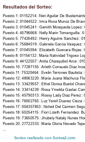 Lista de participantes: 40302156 Doris Guevar Lavajos 001, 16776202 Hermelinda Llamo Vasquez 001, 01043397 Maria Luisa Rodriguez Arista 001, 01154132 Maria Natividad Trigoso Lopez 001, 47491433 Yesenia Medalit Garcia Guevara 001, 01045269 Lourdes Zubiate Cordova 002, 48063220 Maria Juana Machuca Flores 002, 01043466 Maria Noemi Soriano Vargas 002, 01152214 Neri Aguilar De Bustamante 002, 01033412 Sofia Margarita Salazar Tafur 002, 43410218 Tania Tejada Minchan 002, 73443485 Elsa Sofia Cahuaza Esquen 003, 01056141 Elvia Katip Allui 003, 46523216 Keli Zulueta Llanos 003, 01053570 Lucia Manayay Ventura 003, 45790313 Rossy Lady Diaz Perez 003, 76664529 Zulema Sanchez Diaz 003, 75684519 Gabriela Garcia Vasquez 004, 40300182 Irma Tuesta Mori 004, 73650575 Jhubely Nataly Nunes Horna 004, 71116811 Lisette Pachamora Fernandez 004, 16722899 Maria Lucia Espinoza Olano 004, 45831481 Marleny Huancas Goicochea 004, 43500754 Rosa Maria Perez Viton 004, 44564494 Rosa Tarrillo Olano 004, 33731765 Zenaida Vazquez De Garcia 004, 77287155 Arleth Consuelo Diaz Inostroza 005, 44685119 Marita Esther Guevara Gonzales 005, 004357853 Noheli Del Carmen Segueri De Cuicas 005, 74140724 Thalia Milian Mestanza 005, 01036166 Amanda Vergara Rojas 006, 46111101 Bertha Quintos Cabanillas 006, 01043867 Delia Luz Mosqueda Lopez 006, 40249584 Dorlisa Ocampo Soplin 006, 70652037 Elvia Penachi Alberca 006, 01045241 Gemith Mosqueda Lopez 006, 76690892 Gladis Martinez Rodas 006, 72235869 Luis Miguel Alejandria Alejandria 006, 01021580 Margarita Rengifo Isla 006, 75099728 Maria Rosabel Vega Ramirez 006, 45504325 Maria Tania Huaman Astochado 006, 01034487 Maritza Felicia Collazos Villa 006, 01036158 Nelida Abad Velayarce 006, 74529933 Queli Jimena Saavedra Abad 006, 27726946 Rene Chilcon Vilchez 006, 44100688 Rocio Hitamar Acuna Olivera 006, 46582710 Rosa Crecencia Torres Acosta 006, 01026009 Rosa Filomena Velaysosa Ventura 006, 33414239 Rosa Ymelda Gaslac Camus 006, 10408585207 Emerita Herrera Carrasco 007, 70160344 Kerli Anahi Becerra Perez 007, 74404584 Diana Lizeth Ruiz Rodas 008, 27722333 Maria Gloria Nevado Tejada 008, 74576696 Mercedes Ramires Tos 008, 01040520 Elita Perez Cruz De Gabriel 009, 01044522 Irma Rosa Munoz De Bravo 009, 71254854 Itamar Duarez Llanos 009, 07115266 Nelida Martinez Centurion 009, 01174033 Rosa Maldonado Saravia 009, 71765314 Tatiana Maleny Chavez Alarcon 009, 33792492 Alcides Antonio Zumaeta Reategui 010, 44122557 Anita Chasquibol Arce 010, 76571443 Brythany Velasquez Guevara 010, 47085712 Danitza Trinidad Chacon Arista 010, 48295550 Darli Poquis Gomez 010, 48174535 Elisa Torrejon Galoc 010, 01045594 Elizabeth Guevara Rojas 010, 46615717 Elvia Ruiz Soto 010, 40946138 Esperanza Hidalgo Guelac 010, 45902735 Esther Trauco Ramos 010, 33429557 Ethel Dorisa Buelot Chavez 010, 75320464 Evelin Terrones Bautista 010, 60254115 Fiori Lizeth Fernandez Bustamante 010, 33724808 Francisca Castaneda Tuesta 010, 77426492 Henry Aguirre Sanchez 010, 76002765 Luz Yareli Duarez Cieza 010, 77695418 Maelita Collantes Huaman 010, 48681003 Maria Reyna Roman Perez 010, 45796668 Nelly Marin Tomanguilla 010, 33732705 Nury Camus Rojas 010, 74616760 Rosibel Valle Quintana 010, 10389206 Telesvina Qupioc Montenegro 010||.
