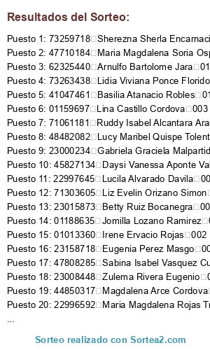 Lista de participantes: 20885643 Alejandro Rupay Machaguay 002, 72876554 Anaelhy Guevara Garay 002, 42931950 Cinthya Johana Perez Rojas 002, 22962176 Dominga Melchor Soria 002, 43830766 Edelmira Rojas Sanchez 002, 23158718 Eugenia Perez Masgo 002, 22999974 Gladys Herrera Alfaro De Salas 002, 45817151 Griselda Cerafina Serna Vargas 002, 01013360 Irene Ervacio Rojas 002, 76348033 Jamir Abel Acosta Huaman 002, 73029401 Jassira Paola Santillan Doria 002, 71568082 Norina Lujan Catalan 002, 72542828 Peggi Berenisse Romero Vidal 002, 71572375 Rosy Serna Pajuelo 002, 70260241 Sofia Del Pilar Apac Romayna 002, 47192168 Stefany Karol Sanchez Funegra 002, 23008448 Zulema Rivera Eugenio 002, 44814570 Celinda Cierto Espinoza 003, 73301715 Freysi Natali Ramirez Eugenio 003, 74616147 Janeth Gabino Penadillo 003, 45541138 Jessica Junelly Gutierrez Rios 003, 01159697 Lina Castillo Cordova 003, 47710184 Maria Magdalena Soria Ospino 003, 47148496 Nancy Mildret Diego Cubos 003, 77035522 Elizabeth Gonzales Perez 004, 22996592 Maria Magdalena Rojas Trujillo 004, 46381736 Maribel Palomino Ponce 004, 40671882 Milagros Anapan Quispe 004, 09626276 Andrea Zelada Alfaro 005, 47223114 Liseth Roxana Camacho Ostos 005, 44850317 Magdalena Arce Cordova 005, 22979085 Victoria Ruiz Cardenas De Arizaga 005, 71303981 Adelinda Lino Arteta 006, 41289777 Alicia Villanueva Arevalo 006, 43256489 Andre Alejandro Caycho Zevallos 006, 71539419 Ariana Nadine Cardenas Rodriguez 006, 23015873 Betty Ruiz Bocanegra 006, 23012339 Guadalupe Pulgar Bravo 006, 60439226 Joissy Miluska Orrego Estrada 006, 22997645 Lucila Alvarado Davila 006, 42921971 Rosaria Arteta Claudio 006, 22987490 Soledad Estrada Gamarra 006, 48894200 Elizabeth Palacios Solorzano 007, 23005508 Eva Tabita Tuesta Rengifo 007, 23016048 Irene Mansueta Perez Garay 007, 22502532 Janet Dominguez Guzman 007, 46854269 Katherine Andree Valles Panduro 007, 45259976 Ledys Maiz Paredes 007, 40282787 Liboria Jorge Santamaria 007, 23019501 Luz Elena Rios Viena 007, 23018943 Nelly Vasquez Macahuachi 007, 40671878 Ruth Mery Zevallos Tenazoa 007, 43126590 Shirley Fatama Tanchiva 007, 43818733 Victoria Arostegui Leandro 007, 60312478 Yesenia Melgarejo Pilco 007, 48586613 Adith Ester Martinez Tapullima 008, 23000234 Gabriela Graciela Malpartida Palacios 008, 41074173 Ines Castaneda Jalmes 008, 70671440 Leslie Madelyn Angulo Bonifacio 008, 71303605 Liz Evelin Orizano Simon 008, 40025675 Maribel Arratea Ponce 008, 45991523 Miladi Ponce Rojas 008, 22888127 Olga Ventura Solorzano 008, 72906654 Oscar Fernando Nunez Ortega 008, 15859748 Vilma Aurora Apolinario Durand 008, 62325440 Arnulfo Bartolome Jara 010, 42182469 Magaly Esther Del Aguila Guerra 010, 76377096 Dior Estip Quispe Burga 011, 41047461 Basilia Atanacio Robles 012, 48482082 Lucy Maribel Quispe Tolentino 012, 47808285 Sabina Isabel Vasquez Custodio 012, 60220426 Susan Luz Fiorella Rojas Fasabi 012, 01188635 Jomilla Lozano Ramirez 013, 74778896 Jose Nolberto Carrillo Ramos 013, 73263438 Lidia Viviana Ponce Florido 013, 47846065 Lila Lucila Geronimo Huarauya 013, 72389531 Lizet Yaritza Nieves Gamarra 013, 73259718 Sherezna Sherla Encarnacion Cuchilla 013, 71061181 Ruddy Isabel Alcantara Aranda 014, 71057324 Yosely Silvia Bravo Gonzales 014, 45827134 Daysi Vanessa Aponte Valdivia 016, 42958223 Rosalia Quispe Guerra 016, 74235953 Rosa Flores Ramos 002, 45559332 Rocio Serafin Benancio 008.
