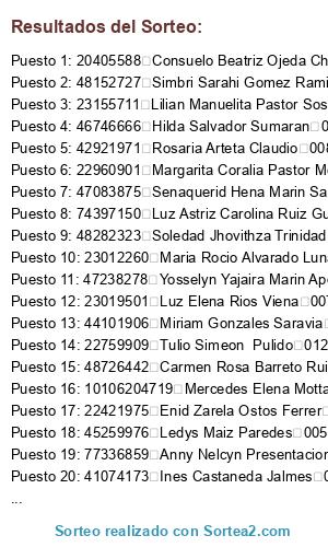 Lista de participantes: 45376479 Alicia Lopez Sacramento 002, 22974887 Alicia Tolentino Morales 002, 72876554 Anaelhy Guevara Garay 002, 09626276 Andrea Zelada Alfaro 002, 23000976 Angel Florido Carhua 002, 74093770 Anghela Judith Gallegos Santiago 002, 77336859 Anny Nelcyn Presentacion Rivera 002, 73211649 Benjamin Ruvina Lopez 002, 77793896 Berenice Deisy Fabian Reyes 002, 46426731 Carla Corina Llontop Arevalo 002, 48726442 Carmen Rosa Barreto Ruiz 002, 23019693 Cesar Luis Gonzales Zevallos 002, 70295636 Clara Rosa Orbe Guayabero 002, 20405588 Consuelo Beatriz Ojeda Chavez 002, 44351546 Daniela Rios Reategui 002, 48806149 Digna Tucto Lopez 002, 76377096 Dior Estip Quispe Burga 002, 22962176 Dominga Melchor Soria 002, 42540745 Eliana Nathaly Camones Barrueta 002, 63345738 Elisa Aquino Poma 002, 76509021 Elizabeth Presentacin Rosario 002, 22421975 Enid Zarela Ostos Ferrer 002, 48639549 Eny Rosales Trinidad 002, 22963039 Feliciana Dominguez Uzuriaga 002, 23003244 Felicita Medrano Valdivia 002, 80124118 Francisca Aguirre Morales 002, 73301715 Freysi Natali Ramirez Eugenio 002, 75208648 Gina Rosly Shupingahua Castillo 002, 22963532 Gladys Elizabeth Salazar Diaz 003, 22884065 Gloria Ayde Velenzuela Ortiz 003, 71059692 Graciela Rojas Duran 003, 74169329 Gris De La Cruz Eduardo 003, 46746666 Hilda Salvador Sumaran 003, 41074173 Ines Castaneda Jalmes 004, 01013360 Irene Ervacio Rojas 004, 76063194 Isabel Karina Villar Perez 005, 76348033 Jamir Abel Acosta Huaman 005, 60439226 Joissy Miluska Orrego Estrada 005, 73533331 Jordy Morales Alcantara 005, 40741793 Juliana Gonzales Solano 005, 43188609 Karol Katerine Aguilar Torres 005, 46854269 Katherine Andree Valles Panduro 005, 45259976 Ledys Maiz Paredes 005, 70671440 Leslie Madelyn Angulo Bonifacio 005, 22996713 Leyla Liliana Garcia Silva 006, 71303425 Lida Liz Rufino Ramirez 006, 73263438 Lidia Viviana Ponce Florido 006, 23155711 Lilian Manuelita Pastor Sosa 006, 75323169 Linda Eliana Pinchi Benancio 006, 47718979 Linda Virginia Maiz Romero 006, 47223114 Liseth Roxana Camacho Ostos 006, 46244334 Lizbeth Anner Santiago Echevarria 006, 48482082 Lucy Maribel Quispe Tolentino 006, 41239018 Luisa Leandro Martin 007, 74397150 Luz Astriz Carolina Ruiz Gutierrez De Gallo 007, 23019501 Luz Elena Rios Viena 007, 45450746 Luz Mery Caqui Isidro 007, 40674619 Luz Rocio Ortega Lopez 007, 42182469 Magaly Esther Del Aguila Guerra 007, 71304078 Marbelita Candy Perez Encarnacion 007, 22960901 Margarita Coralia Pastor Mercado 007, 41112015 Maria Luz Gonzales Maiz 007, 22996592 Maria Magdalena Rojas Trujillo 007, 47710184 Maria Magdalena Soria Ospino 007, 23012260 Maria Rocio Alvarado Luna 007, 40025675 Maribel Arratea Ponce 007, 23001765 Maricha Rodriguez Camavilca 007, 23018754 Maritza Meza Tapullima 007, 22991299 Maritza Rodriguez Grijalva 007, 61275472 Mary Marilin Ponce Rivera 007, 75821898 Marylen Santamaria Ysidro 007, 10260371 Maximina Baltazar Espiritu 007, 10106204719 Mercedes Elena Motta Tarazona 007, 48669036 Midalina Marleni Elguira Gonzales 007, 22408207 Miguel Angel Angulo Dominguez 007, 45991523 Miladi Ponce Rojas 007, 47804464 Milagros Lizet Escobal Salazar 007, 44101906 Miriam Gonzales Saravia 008, 73579562 Mishelle Alexandra Torres Garcia 008, 46573522 Misly Jhandira Bravo Arostegui 008, 23018943 Nelly Vasquez Macahuachi 008, 46017770 Nelson Rodolfo Quito Damacio 008, 48802363 Nely Lizbeth Campos Miravak 008, 22888127 Olga Ventura Solorzano 008, 46347343 Palpi Milagros Lastra Romero 008, 72504440 Pilar Guadalupe Isidro Gomez 008, 22478756 Romaldo Retis Espiritu 008, 22988783 Rosa Adelina Camasca Panduro 008, 42921971 Rosaria Arteta Claudio 008, 75918002 Rosimari Claudia Irribarren Falcon 008, 71572375 Rosy Serna Pajuelo 008, 78378297 Ruth Amelia Guardia Amante 008, 47808285 Sabina Isabel Vasquez Custodio 008, 47083875 Senaquerid Hena Marin Salas De Cubas 009, 44848479 Senia Antonia Lino Aquino 010, 45794533 Shirley Tatiana Baltazar Olano 010, 80094001 Silveria Tenazoa Silva De Saldana 011, 48152727 Simbri Sarahi Gomez Ramirez 011, 48282323 Soledad Jhovithza Trinidad Leandro 012, 47192168 Stefany Karol Sanchez Funegra 012, 46681282 Stefhane Rossi Rodriguez Garcia 012, 71306421 Thais Leslie Retis Inocencio 012, 22759909 Tulio Simeon Pulido 012, 43818733 Victoria Arostegui Leandro 012, 15859748 Vilma Aurora Apolinario Durand 013, 47238278 Yosselyn Yajaira Marin Apolinario 013, 23008228 Yrma Flores Cantaro 014, 45214496 Zoila Carolina Orbezo Lorez 014, 23008448 Zulema Rivera Eugenio 013.