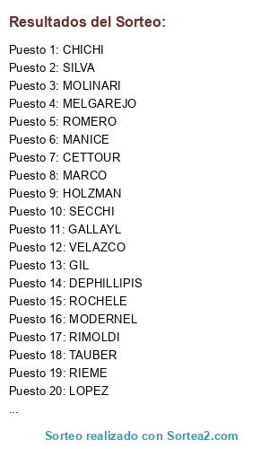 Lista de participantes: ARREJORIA, CETTOUR, CHICHI, GALLAYL, GALLAYM, GIACCHELO, GIL, HOLZMAN, IRIBARREN, LOPEZ, MANICE, MARCO, MELGAREJO, MODERNEL, MOLINARI, RIEME, RIMOLDI, ROCHELE, ROMERO, SANCHIS, SECCHI, SILVA, TAUBER, VELAZCO, DEPHILLIPIS.