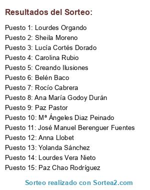 Lista de participantes: Belén Baco, Mª Ángeles Diaz Peinado, Creando Ilusiones, Lourdes Vera Nieto, Sheila Moreno, Lourdes Orgando, Carolina Rubio, Paz Chao Rodríguez, Lucía Cortés Dorado, Rocío Cabrera, Ana María Godoy Durán, Paz Pastor, Anna Llobet, José Manuel Berenguer Fuentes, Yolanda Sánchez.