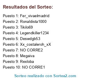 Lista de participantes: Tikilo69, Deswdgb53, Fer_vivaelmadrid, Legendkiller1234, Megaiva, Rexloba, Ronaldista1000, Xx_costaleroh_xX, NO CORRE1, NO CORRE2.