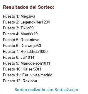 Lista de participantes: Kaiser69f1, Ronaldista1000, Megaiva, Deswdgb53, Fer_vivaelmadrid, Legendkiller1234, Mariodeleon1011, Maarkk19, Rubenteve, Rexloba, Tikilo69, Jaf1014.