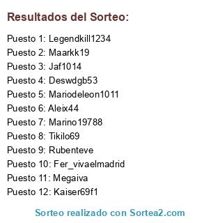 Lista de participantes: Aleix44, Megaiva, Kaiser69f1, Fer_vivaelmadrid, Rubenteve, Maarkk19, Tikilo69, Mariodeleon1011, Jaf1014, Legendkill1234, Marino19788, Deswdgb53.