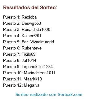 Lista de participantes: Kaiser69f1, Rubenteve, Ronaldista1000, Jaf1014, Megaiva, Tikilo69, Deswgb53, Rexloba, Maarkk19, Mariodeleon1011, Fer_Vivaelmadrid, Legendkiller1234.