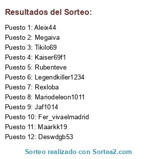 Lista de participantes: Aleix44, Kaiser69f1, Megaiva, Maarkk19, Tikilo69, Rubenteve, Fer_vivaelmadrid, Deswdgb53, Legendkiller1234, Mariodeleon1011, Rexloba, Jaf1014.