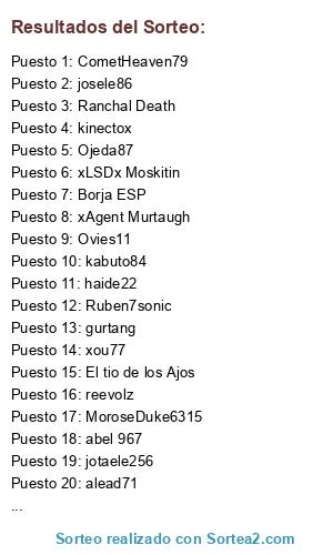 Lista de participantes: IL MURO, Csneijder, varox ESP, Borja ESP, MoroseDuke6315, clockwork1904., CometHeaven79, Ranchal Death, xou77, Ojeda87, shr19, abel 967, Rafarabanne, LoPeina, Ruben7sonic, jotaele256, xLSDx Moskitin, El tio de los Ajos, josele86, netbetico, Chekevo, kinectox, BitDiego12, kabuto84, haide22, Ovies11, SprayingBus1, El eXecuter, xAgent Murtaugh, gurtang, alead71, reevolz.