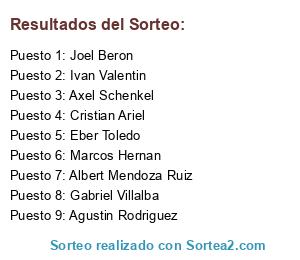Lista de participantes: Marcos Hernan, Cristian Ariel, Gabriel Villalba, Albert Mendoza Ruiz, Axel Schenkel, Joel Beron, Ivan Valentin, Agustin Rodriguez, Eber Toledo.
