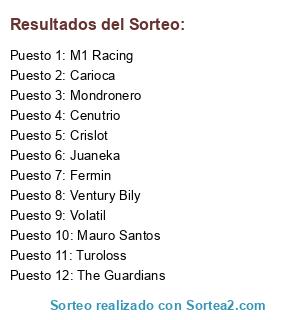 Lista de participantes: M1 Racing, Ventury Bily, Mauro Santos, Carioca, Fermin, Cenutrio, Juaneka, The Guardians, Volatil, Turoloss, Crislot, Mondronero.