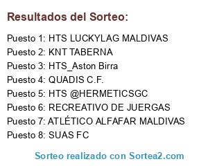 Lista de participantes: KNT TABERNA, SUAS FC, HTS LUCKYLAG MALDIVAS, ATLÉTICO ALFAFAR MALDIVAS, HTS @HERMETICSGC, RECREATIVO DE JUERGAS, QUADIS C.F., HTS_Aston Birra.
