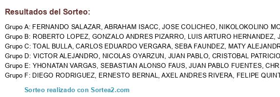 Lista de participantes: YHONATAN VARGAS, SEBASTIAN ALONSO FAUS, ERNESTO BERNAL, FELIPE QUINTEROS, SEBA FAUNDEZ, CARLOS EDUARDO VERGARA, AXEL ANDRES RIVERA, DIEGO RODRIGUEZ, NICOLAS OYARZUN, JAVIER FLORES, NIKOLOKOLINO MORALES, FERNANDO SALAZAR, MATY ALEJANDRO POBLETE, GONZALO ANDRES PIZARRO, JUAN PABLO, TOAL BULLA, CRISTOBAL PATRICIO, VICTOR ALEJANDRO, CHRISTOPER ALEXIS, ROBERTO LOPEZ, JOSE COLICHEO, LUIS ARTURO HERNANDEZ, JUAN PABLO FUENTES, ABRAHAM ISACC.