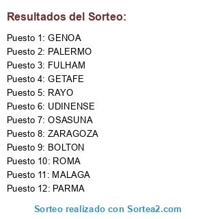 Lista de participantes: BOLTON, OSASUNA, MALAGA, PARMA, ZARAGOZA, FULHAM, RAYO, ROMA, PALERMO, UDINENSE, GETAFE, GENOA.