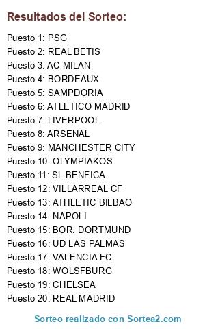 Lista de participantes: ATLETICO MADRID, SAMPDORIA, BORDEAUX, REAL MADRID, VALENCIA FC, ATHLETIC BILBAO, REAL BETIS, CHELSEA, BOR. DORTMUND, NAPOLI, MANCHESTER CITY, OLYMPIAKOS, PSG, UD LAS PALMAS, VILLARREAL CF, WOLSFBURG, LIVERPOOL, SL BENFICA, ARSENAL, AC MILAN.
