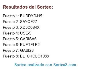 Lista de participantes: CARISA6, GABI28, USE-9, XD3C0S4X, SAYCE27, BUDDYDJ15, KUETELE2, EL_CHOLO1988.