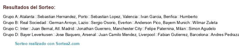 Lista de participantes: Barcelona Andres Pedraza, Lazio Sergio Osorio, Manchester City Felipe Paternina, Bayer Leverkusen Jose Baquero, Liverpool Fabian Gutierrez, Real Sociedad German Arroyo, Bayern Munich Wilmar Zuleta, Benfica Humberto, Inter Juan Bernal, Atalanta Sebastian Hernandez, Atl. Madrid Jonathan Guerrero, Everton Anderson Pico, Arsenal Juan Camilo Mendez, Milan Simon Agudelo, Valencia Ivan Garcia, Porto Sebastian Lopez.