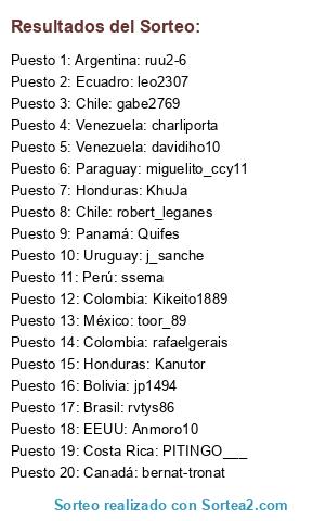Lista de participantes: Argentina: ruu2-6, Brasil: rvtys86, Chile: gabe2769, Colombia: rafaelgerais, Venezuela: davidiho10, Ecuadro: leo2307, Paraguay: miguelito_ccy11, Perú: ssema, Uruguay: j_sanche, Bolivia: jp1494, Costa Rica: PITINGO___, Honduras: KhuJa, México: toor_89, EEUU: Anmoro10, Panamá: Quifes, Canadá: bernat-tronat, Chile: robert_leganes, Colombia: Kikeito1889, Honduras: Kanutor, Venezuela: charliporta.