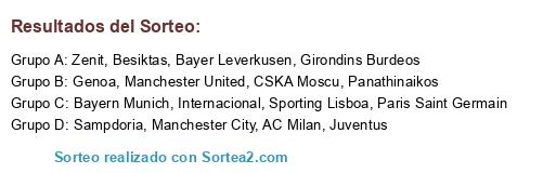Lista de participantes: Internacional, AC Milan, Girondins Burdeos, Bayern Munich, Juventus, Panathinaikos, Genoa, Besiktas, Zenit, Sampdoria, Manchester City, Bayer Leverkusen, Sporting Lisboa, CSKA Moscu, Paris Saint Germain, Manchester United.