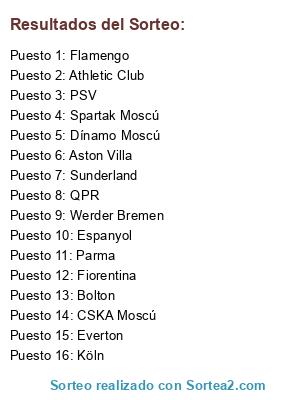 Lista de participantes: Dínamo Moscú, Flamengo, Espanyol, Aston Villa, Athletic Club, Bolton, CSKA Moscú, Everton, Spartak Moscú, Fiorentina, Sunderland, Parma, Köln, PSV, Werder Bremen, QPR.