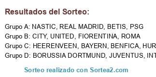 Lista de participantes: ROMA, JUVENTUS, BORUSSIA DORTMUND, HURACAN, REAL MADRID, PSV, BAYERN, UNITED, CITY, HEERENVEEN, NASTIC, FIORENTINA, INTER, PSG, BETIS, BENFICA.