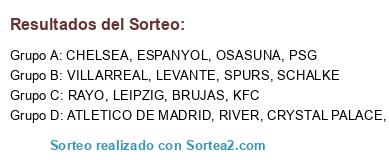 Lista de participantes: RAYO, ATLETICO DE MADRID, BARÇA, LEVANTE, PSG, SCHALKE, LEIPZIG, KFC, VILLARREAL, SPURS, OSASUNA, BRUJAS, RIVER, CHELSEA, ESPANYOL, CRYSTAL PALACE.