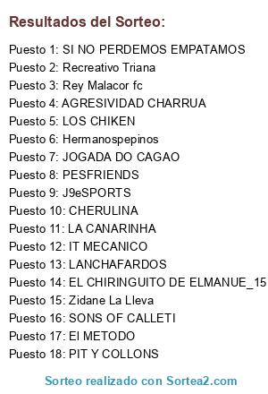 Lista de participantes: SI NO PERDEMOS EMPATAMOS, PIT Y COLLONS, IT MECANICO, El METODO, JOGADA DO CAGAO, LOS CHIKEN, CHERULINA, SONS OF CALLETI, PESFRIENDS, Rey Malacor fc, Hermanospepinos, J9eSPORTS, Recreativo Triana, LANCHAFARDOS, AGRESIVIDAD CHARRUA, LA CANARINHA, EL CHIRINGUITO DE ELMANUE_15 FC, Zidane La Lleva.
