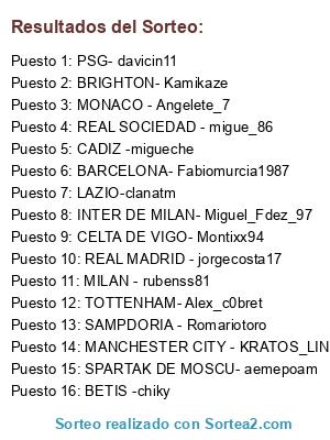 Lista de participantes: MANCHESTER CITY - KRATOS_LINARES, SPARTAK DE MOSCU- aemepoam, CADIZ -migueche, PSG- davicin11, MILAN - rubenss81, CELTA DE VIGO- Montixx94, LAZIO-clanatm, SAMPDORIA - Romariotoro, TOTTENHAM- Alex_c0bret, MONACO - Angelete_7, BRIGHTON- Kamikaze, REAL SOCIEDAD - migue_86, BETIS -chiky, REAL MADRID - jorgecosta17, INTER DE MILAN- Miguel_Fdez_97, BARCELONA- Fabiomurcia1987.