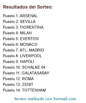 Lista de participantes: ARSENAL, GALATASARAY, MILAN, ATL. MADRID, TOTTENHAM, LIVERPOOL, ZENIT, EVERTON, SEVILLA, MONACO, ROMA, NAPOLI, FIORENTINA, SCHALKE 04.