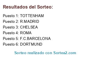 Lista de participantes: DORTMUND, CHELSEA, TOTTENHAM, F.C.BARCELONA, ROMA, R.MADRID.