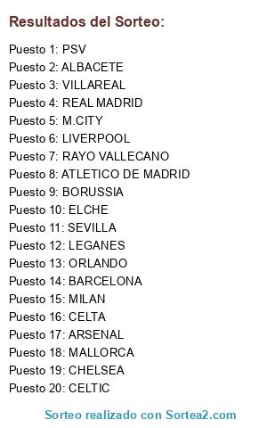 Lista de participantes: PSV, BESIKTAS, CELTA, AT.MADRID, MANCHESTER UNITED, LIVERPOOL, ROMA, REAL MADRID, TENERIFE, MANCHESTER CITY, ELCHE, BARCELONA, SEVILLA, UNION ESPAÑOLA, LAS PALMAS, TOTTENHAM, LEICESTER CITY, COLO COLO, BORUSIA DORTMUND, ARSENAL, PSG.