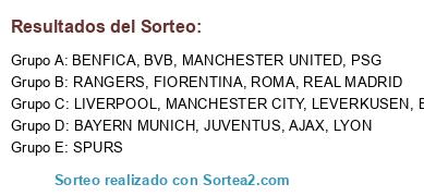Lista de participantes: BARCELONA, BENFICA, FIORENTINA, PSG, REAL MADRID, BVB, LYON, SPURS, MANCHESTER CITY, AJAX, LEVERKUSEN, BAYERN MUNICH, MANCHESTER UNITED, LIVERPOOL, JUVENTUS, ROMA, RANGERS.