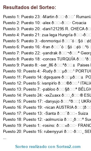 Lista de participantes: Noruega @Nelka_23, Islandia @srrivlah, Portugal @Norman000, Francia @elfus21, España @verratta, Inglaterra @Franlepe34, Gales @Bukron00, Paises bajos @candelaluisa, Ucrania @Yelmaister, Bélgica @Jordisanvi82, Italia @cabezaablana, Turquía @Sheraton159, Alemania @Manugfcv, Croacia @Juanr33, Polonia @Ruben_1981_1, Argentina INVITADA @JesusTorress.