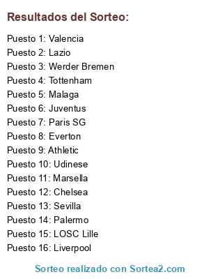 Lista de participantes: Lazio, Juventus, Udinese, Palermo, Liverpool, Tottenham, Everton, Chelsea, Sevilla, Valencia, Malaga, Athletic, Marsella, Paris SG, Werder Bremen, LOSC Lille.