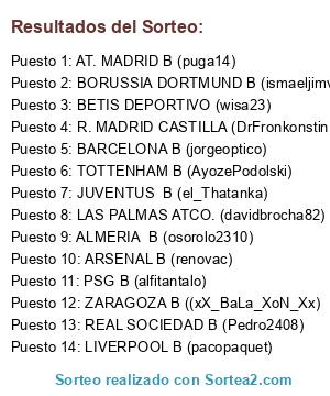 Lista de participantes: REAL SOCIEDAD B (Pedro2408), TOTTENHAM B (AyozePodolski), LIVERPOOL B (pacopaquet), ALMERIA B (osorolo2310), ZARAGOZA B ((xX_BaLa_XoN_Xx), BARCELONA B (jorgeoptico), LAS PALMAS ATCO. (davidbrocha82), PSG B (alfitantalo), BETIS DEPORTIVO (wisa23), R. MADRID CASTILLA (DrFronkonstin), BORUSSIA DORTMUND B (ismaeljimva), ARSENAL B (renovac), JUVENTUS B (el_Thatanka), AT. MADRID B (puga14).