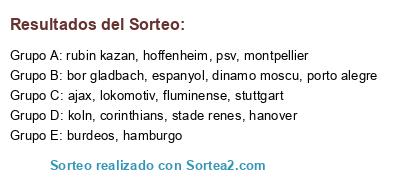 Lista de participantes: dinamo moscu, rubin kazan, lokomotiv, hoffenheim, bor gladbach, koln, hamburgo, hanover, stuttgart, corinthians, fluminense, porto alegre, espanyol, burdeos, montpellier, stade renes, ajax, psv.