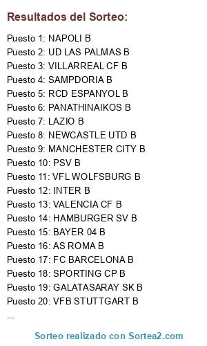 Lista de participantes: AC MILAN B, AJAX B, ARSENAL B, AS ROMA B, ATHLETIC BILBAO B, ATLETICO MADRID B, BAYER 04 B, BOCA JUNIORS B, BOR. DORTMUND B, CHELSEA B, EVERTON B, FC BARCELONA B, FC BAYERN B, FC PORTO B, FC SCHALKE 04 B, FIORENTINA B, GALATASARAY SK B, GETAFE CF B, HAMBURGER SV B, INTER B, LAZIO B, LIVERPOOL B, MALAGA CF B, MANCHESTER CITY B, NAPOLI B, NEWCASTLE UTD B, OLYMPIAKOS B, OLYMPIQUE LYON B, PANATHINAIKOS B, PSG B, PSV B, R. SPORTING B, RAYO VALLECANO B, RC DEPORTIVO B, RCD ESPANYOL B, REAL MADRID CF B, REAL SOCIEDAD B, SAMPDORIA B, SEVILLA FC B, SPORTING CP B, SPURS B, SUNDERLAND B, UD LAS PALMAS B, UDINESE B, VALENCIA CF B, VFB STUTTGART B, VFL WOLFSBURG B, VILLARREAL CF B.