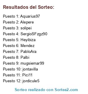 Lista de participantes: Aquarius97, Alepere, Palbi, Heyibiza, SergioSFzgz90, jordicule5, solipei, Mendez, mugsiemar99, Pici11, PabloAra, jontavilla.