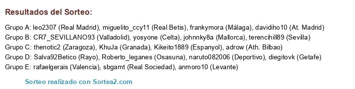 Lista de participantes: roberto_leganes (Ath. Bilbao), toor_89 (At. Madrid), davidiho10 (Espanyol), sergiobg (Barcelona), Charliporta (Getafe), kikeito1889 (Málaga), KhuJa (Real Betis), anmoro10 (Real Madrid), j_sanche (Real Sociedad), rafaelgerais (Sevilla), jp1494 (Valencia), leo2307 (Villareal), ruu2-6 (Zaragoza).