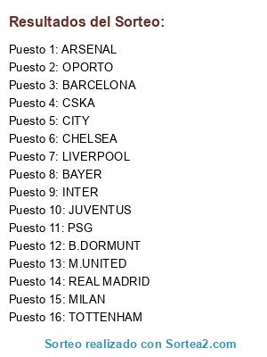 Lista de participantes: CSKA, LIVERPOOL, PSG, OPORTO, B.DORMUNT, JUVENTUS, ARSENAL, BARCELONA, M.UNITED, INTER, TOTTENHAM, REAL MADRID, CITY, BAYER, MILAN, CHELSEA.
