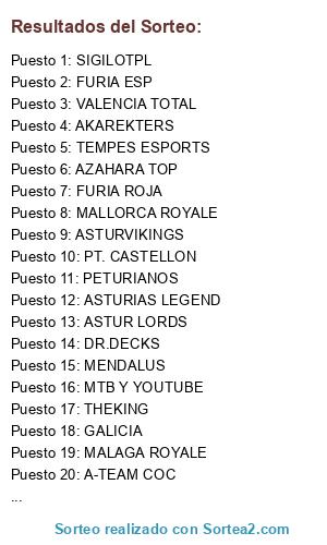 Lista de participantes: A-TEAM COC, MALAGA ROYALE, PT. CASTELLON, PETURIANOS, ANARQUIA69, ASTUR LORDS, ASTURIAS LEGEND, ASTURVIKINGS, AZAHARA TOP, CALDO GALEGO, CLAN SPAIN, Clash Blow, CLOVERS ROYALE, AKAREKTERS, ESPAÑA SOLDIERS, FURIA ROJA, GALICIA, MENDALUS, SHOWTIME TEAM, TEMPES ESPORTS, CALALAS, HIJOS DE LA RUINA, LA ELITE, MALLORCA ROYALE, MTB Y YOUTUBE, SIGILOTPL, THEKING, WARLOCKS, ICE IGNITE, DR.DECKS, FURIA ESP, VALENCIA TOTAL.