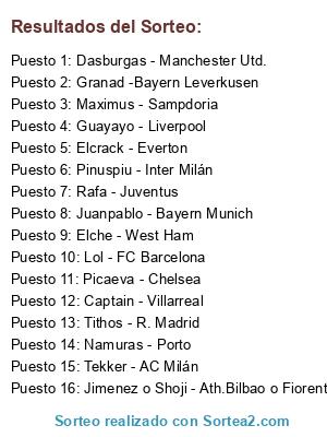 Lista de participantes: Tithos - R. Madrid, Guayayo - Liverpool , Lol - FC Barcelona, Elche - West Ham, Juanpablo - Bayern Munich, Dasburgas - Manchester Utd., Picaeva - Chelsea, Pinuspiu - Inter Milán, Rafa - Juventus, Jimenez o Shoji - Ath.Bilbao o Fiorentina, Tekker - AC Milán, Granad -Bayern Leverkusen, Elcrack - Everton, Captain - Villarreal, Namuras - Porto, Maximus - Sampdoria.