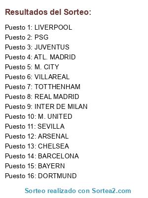 Lista de participantes: BARCELONA, BAYERN, M. UNITED, REAL MADRID, M. CITY, JUVENTUS, PSG, CHELSEA, ATL. MADRID, ARSENAL, DORTMUND, LIVERPOOL, SEVILLA, TOTTHENHAM, VILLAREAL, INTER DE MILAN.