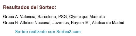 Lista de participantes: Atletico de Madrid, Barcelona, PSG, Olympique Marsella, Atletico Nacional, Bayern M., Juventus, Valencia.