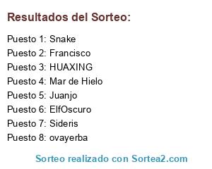 Lista de participantes: Snake, ovayerba, ElfOscuro, Mar de Hielo, Sideris, Francisco, HUAXING, Juanjo.