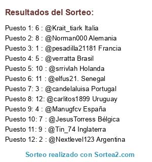 Lista de participantes: 1 : @pesadilla21181 Francia, 2 : @Nextlevel123 Argentina, 3 : @candelaluisa Portugal, 4 : @Manugfcv España, 5 : @verratta Brasil, 6 : @Krait_tiark Italia, 7 : @JesusTorress Bélgica, 8 : @Norman000 Alemania, 9 : @Tin_74 Inglaterra, 10 : @srrivlah Holanda, 11 : @elfus21. Senegal, 12: @carlitos1899 Uruguay.
