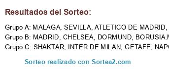 Lista de participantes: MADRID, ATLETICO DE MADRID, INTER DE MILAN, DORMUND, NAPOLES, BAYER, SEVILLA, BORUSIA.MON, GETAFE, CHELSEA, MALAGA, SHAKTAR.