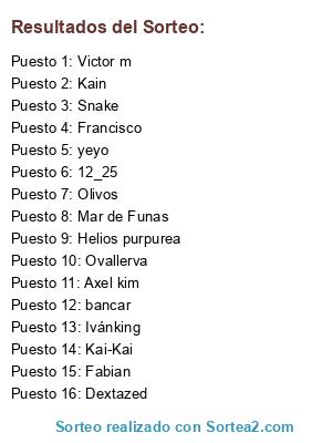 Lista de participantes: Snake, Kai-Kai, Olivos, yeyo, Helios purpurea, Mar de Funas, 12_25, Ovallerva, Kain, Ivánking, Dextazed, Axel kim, Fabian, Francisco, Victor m, bancar.